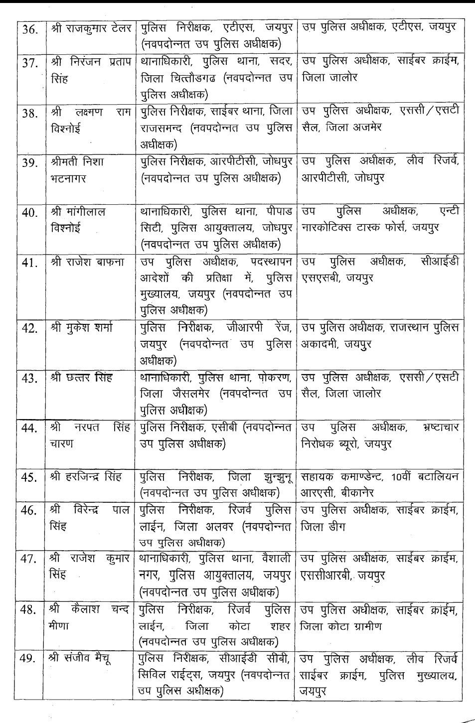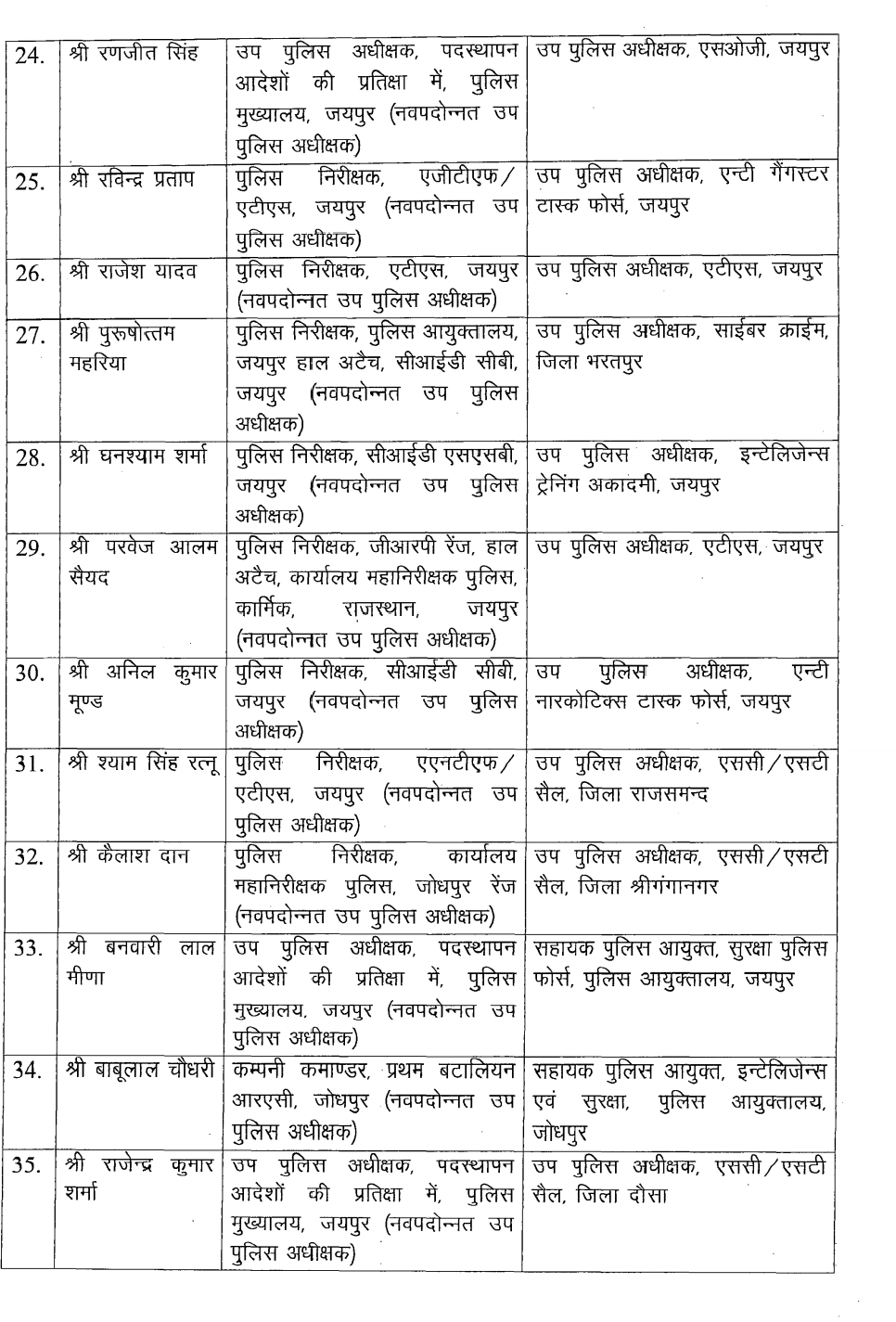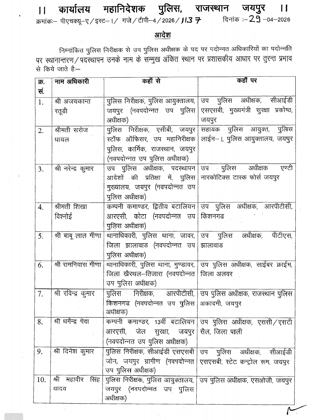 इसके अलावा रविन्द्र कुमार और मुकेश शर्मा को राजस्थान पुलिस एकेडमी (RPA) में DSP के रूप में नियुक्त किया गया है। RPA में उनकी भूमिका नए पुलिस अधिकारियों को प्रशिक्षित करने की होगी, जिससे भविष्य की पुलिसिंग प्रणाली को मजबूत आधार मिलेगा।