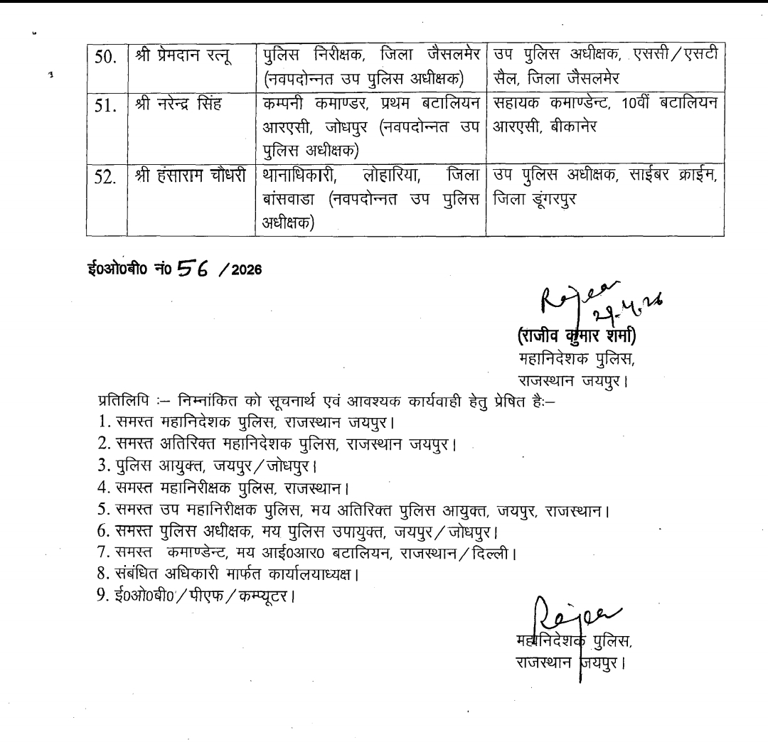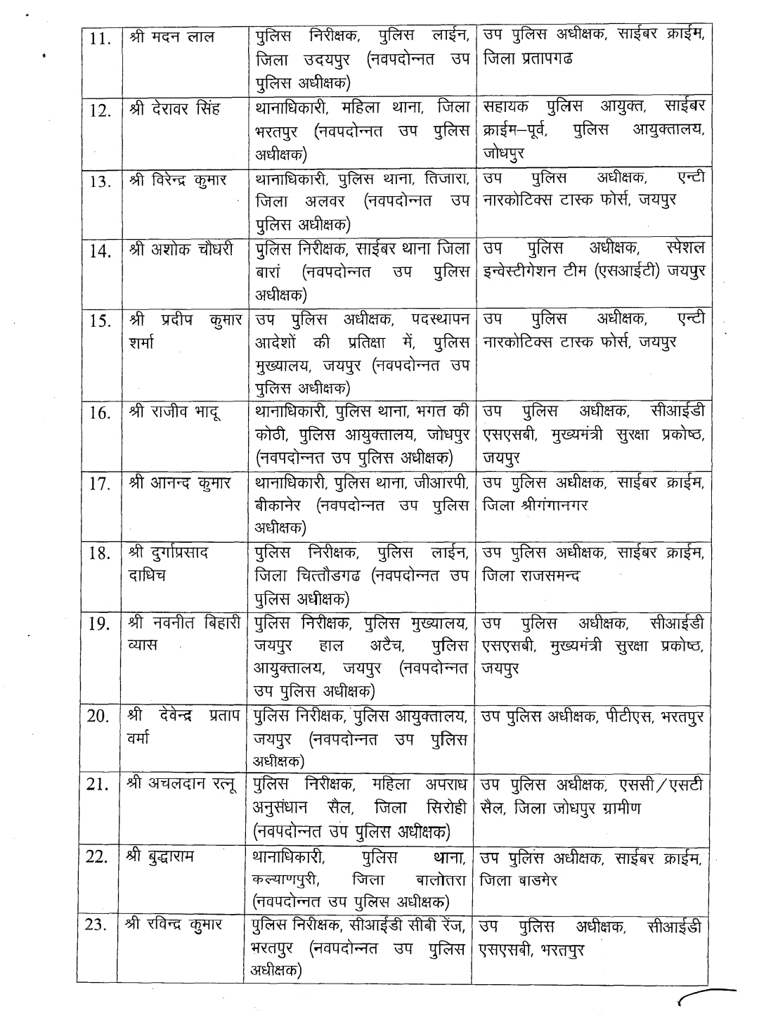 जिलों में भी बड़े स्तर पर बदलाव किए गए हैं। मदन लाल को प्रतापगढ़, आनंद कुमार को श्रीगंगानगर, बुद्धाराम को बाड़मेर, पुरुषोत्तम महरिया को भरतपुर, निरंजन प्रताप सिंह को जालोर और रामनिवास मीणा को अलवर में साइबर क्राइम DSP के रूप में तैनात किया गया है। इन नियुक्तियों से स्थानीय स्तर पर कानून-व्यवस्था को मजबूत करने और अपराध नियंत्रण को अधिक प्रभावी बनाने की उम्मीद जताई जा रही है।